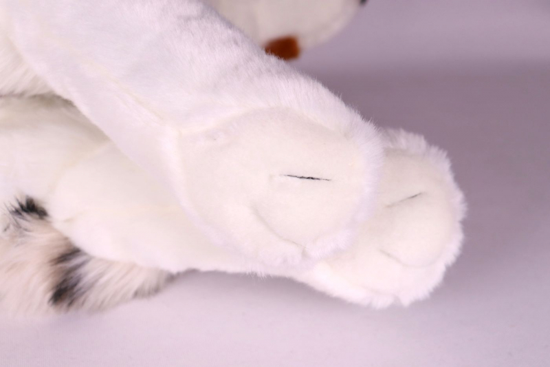 Plüschhund mit Plüschnase, gewichteten Pfoten und weichem Fell mit eingewebtem Muster.